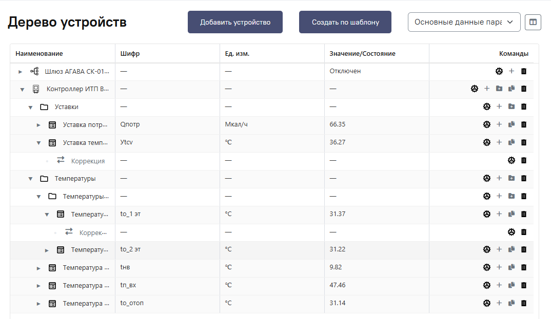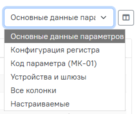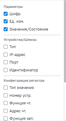 При первоначальном открытии страницы отображаются Основные параметры устройств. Объем отображаемых параметров можно изменить путем выбора перечня параметров из списка предварительно сформированных групп:
