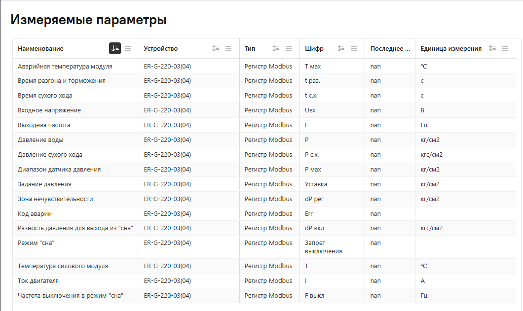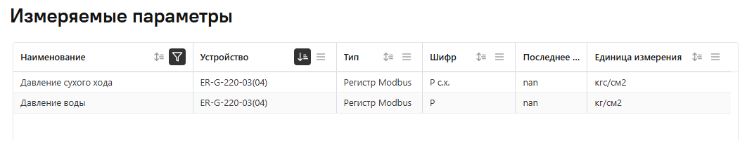На странице с измеряемыми параметрами в табличном виде отображается перечень всех измеряемых параметров проекта со всех устройств.