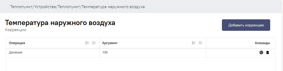 Для добавления коррекции получаемых данных нажмите на название параметра на странице "Параметры устройства" для перехода на страницу добавления коррекции: