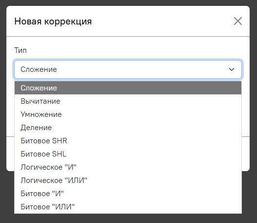 и нажмите копку "Добавить коррекцию" или на странице "Дерево устройств" в поле команд для параметра нажмите "+". На экране появляется окно параметров добавляемой коррекции. В поле «Аргумент» вводится значение корректировки, а в поле «Тип» – выполняемая операция с измеренным значением. Типы доступных операций для коррекции можно выбрать из выпадающего списка.