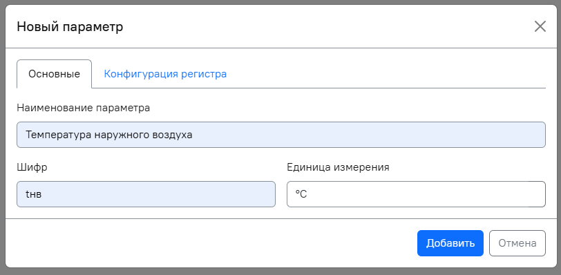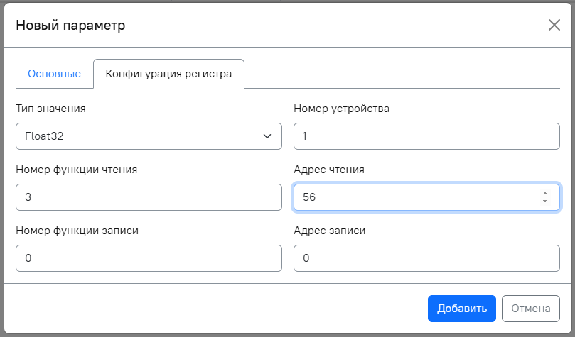 При нажатии на кнопку «Добавить параметр» в выпадающем окне необходимо заполнить поля описания отображения параметра в проекте во вкладке "Основные" и данные о регистре протокола Modbus во вкладке "Конфигурация регистра":