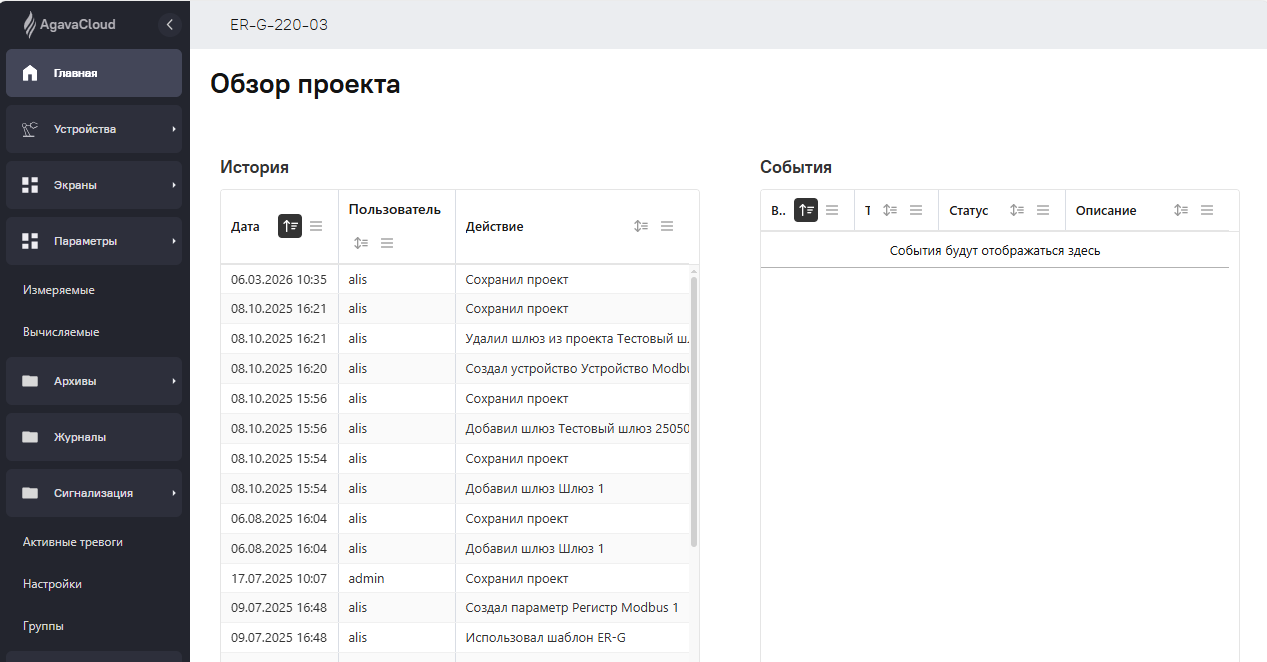 Для настройки параметров проекта перейдите на страницу редактируемого проекта нажатием на поле с выбранным проектом. При переходе на настраиваемый проект открывается главная страница «Обзор проекта» на которой отображается история действий пользователя и события при работе подключенного к системе оборудования.